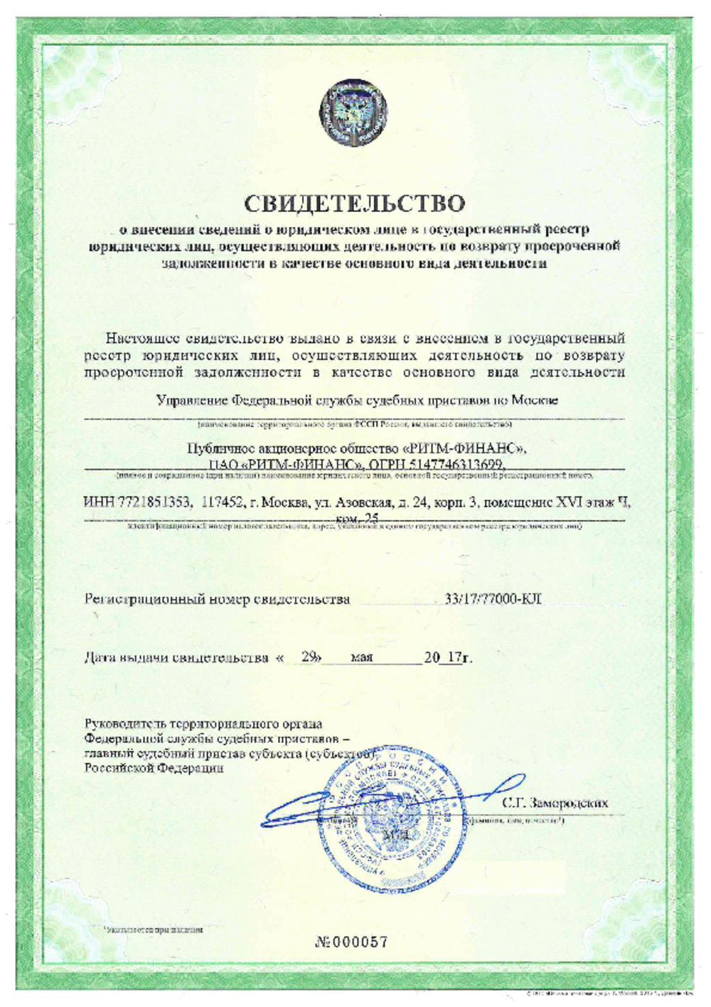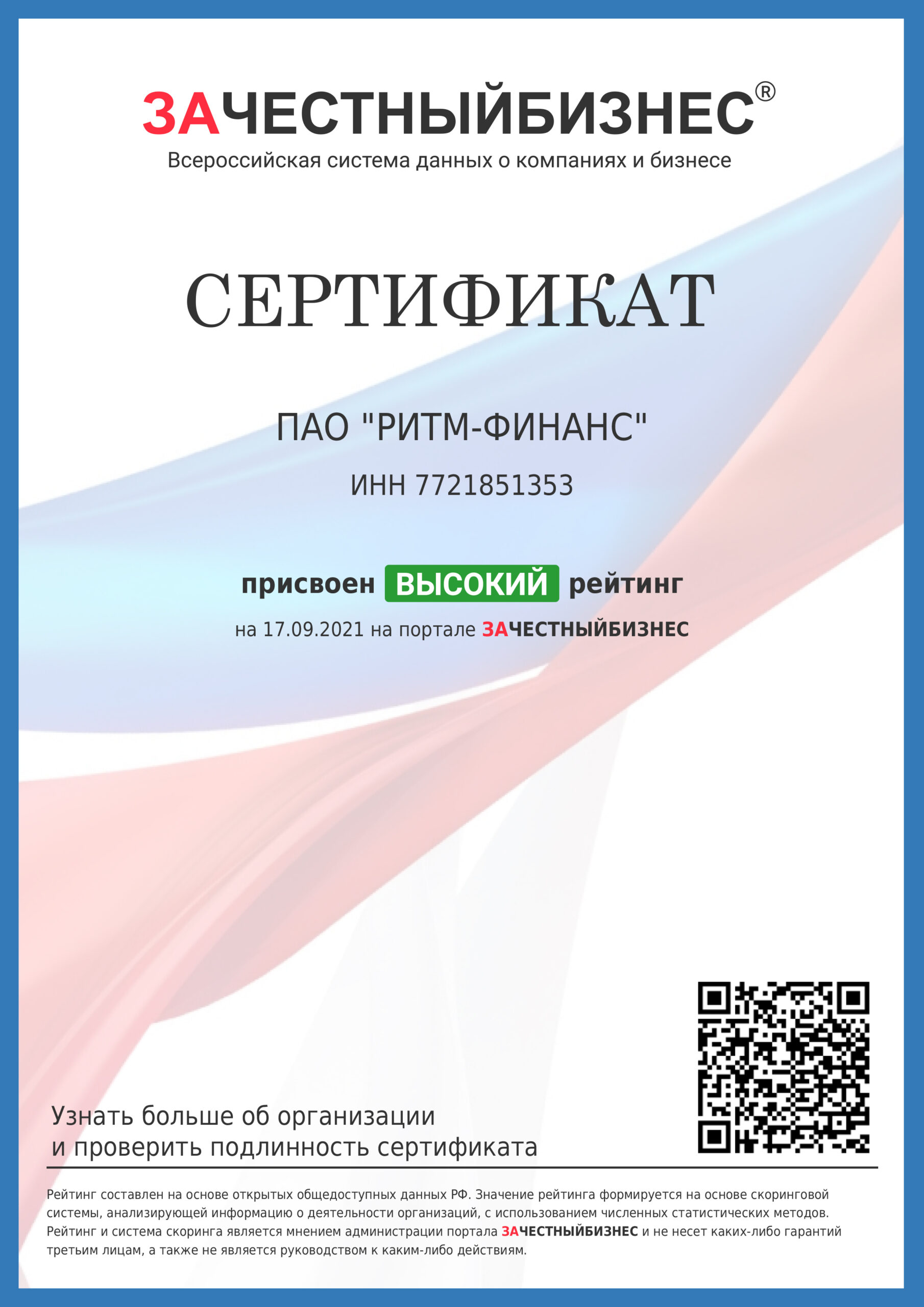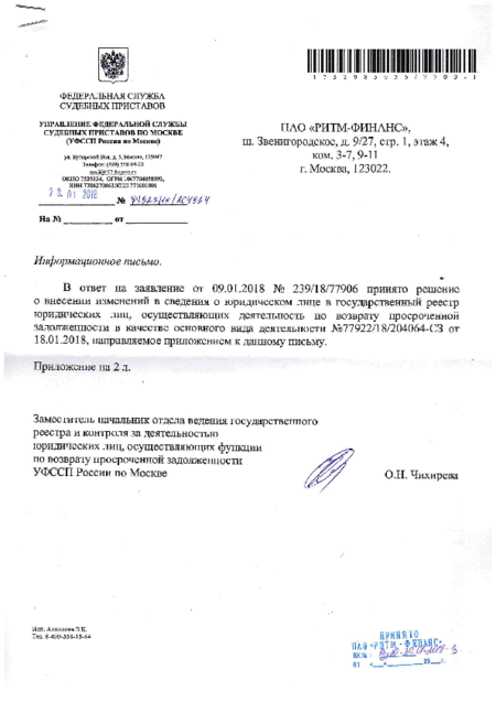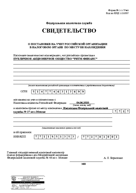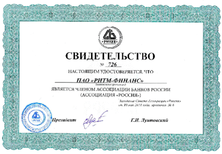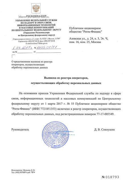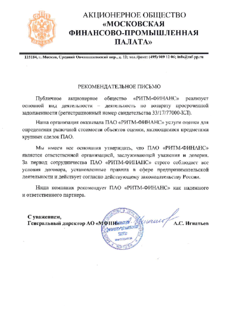 Documentation Download the Charter of PAO RHYTHM-FINANCE (6.7 MB) Download Certificate of incorporation 2014 Mobile Services, JSC now PAO RITM-FINANCE (0.3 MB) Download Certificate of Entry in the National Register of Legal Entities carrying out debt collection activities as a main line of business (0.2 MB) Download Decision of Entry in the National Register of Legal Entities carrying out debt collection activities as a main line of business (0.7 MB) Download Company Data Protection Policy as of 29.06.2017 (2.9 MB) Download Company Data Protection Policy as of 10.09.2020 (2.9 MB) Download Moscow Chamber of Commerce and Industry Recommendation Letter (0.2 MB) Download Association of Banks of Russia Certificate (0.4 MB) INTERFAX: Corporate Information Disclosure Center. Address: http://www.e-disclosure.ru/portal/company.aspx?id=35615 PAO RITM-FINANCE awarded a high rating on the HONESTBUSINESS portal